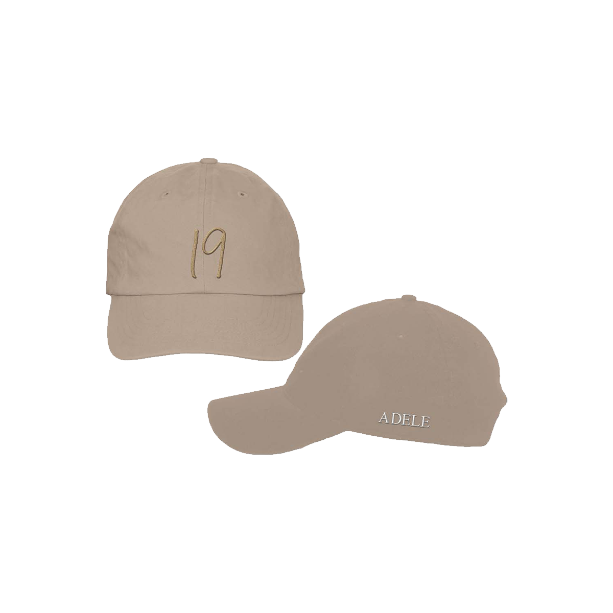 Adjustable tan hat features embroidered '19' on the front and 'Adele' on the left side