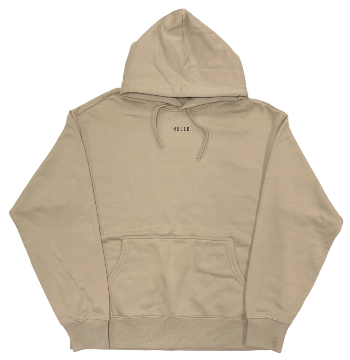 Bone pullover hoodie with 'Hello' printed on the front and large-printed 'Hello' on the back.